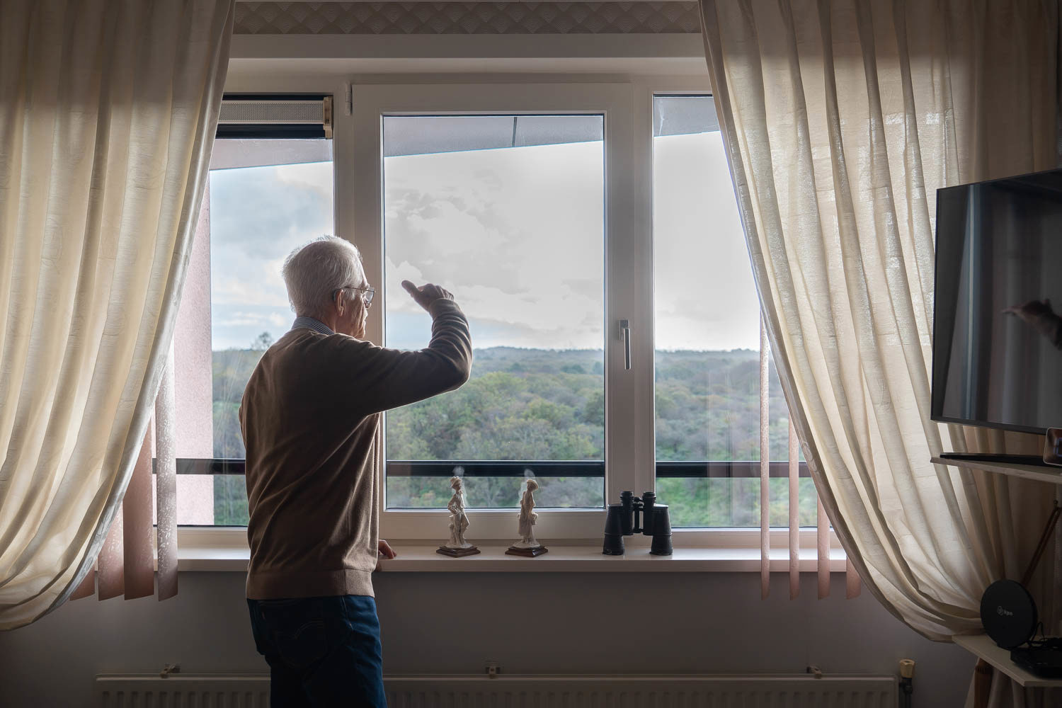 Vanaf zijn appartement op de 9e verdieping heeft Herman Kruize (80) een fantastisch weids uitzicht over de zee, duinen en haven van Zaandam tot Zandvoort. Herman is al vijfentwintig jaar actief in IJmuiden met het opruimen van vuil rondom de Schiplaan en dat verdient een bloemetje.