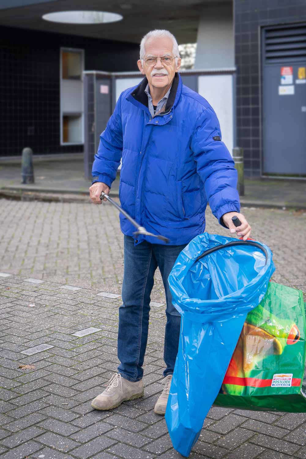 Gewapend met grijper en afvalzakken en voor vandaag even op sportschoenen want ‘normaal heb ik laarzen aan’ ziet Herman buiten meteen rommel liggen en handig als hij is geworden met de grijper zit het in een oogwenk in de vuilniszak. Herman wil de wijk schoonhouden zo lang als het kan.