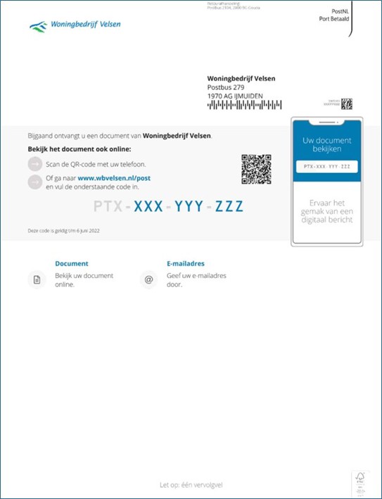 Indien u graag brievenbuspost ontvangt, dan ontvangt u een papieren brief. Deze brief zal er anders uitzien dan u gewend bent. In de envelop vindt u een voorblad waar een unieke PTX-code op vermeld staat. U kunt uw papieren post dus óók digitaal bekijken.
