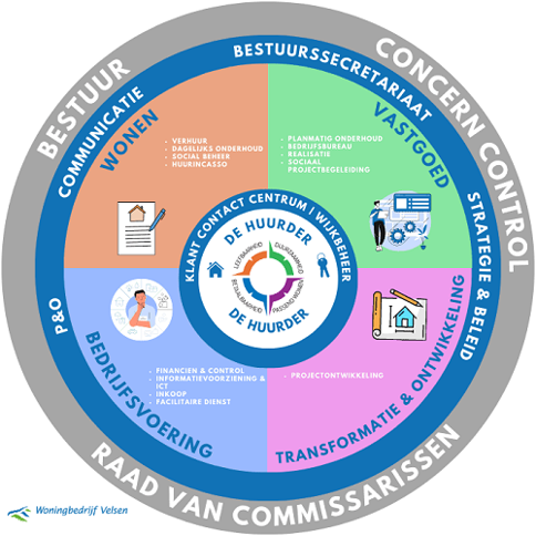 Bekijk hieronder het organogram van Woningbedrijf Velsen. Je ziet dat de huurder bij ons centraal staat en met welke afdelingen en thema’s we hieraan werken.