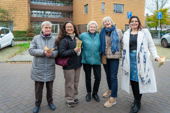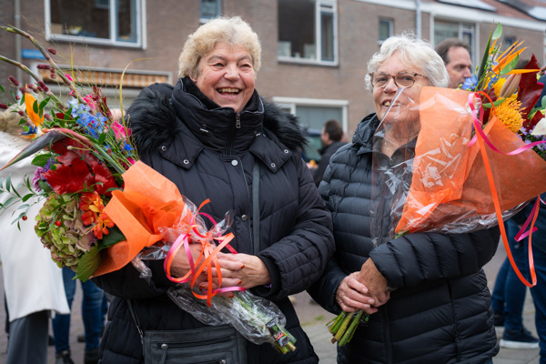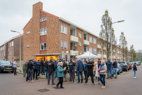 Bewoners, medewerkers van AC Borst Bouw en Woningbedrijf Velsen vieren de oplevering